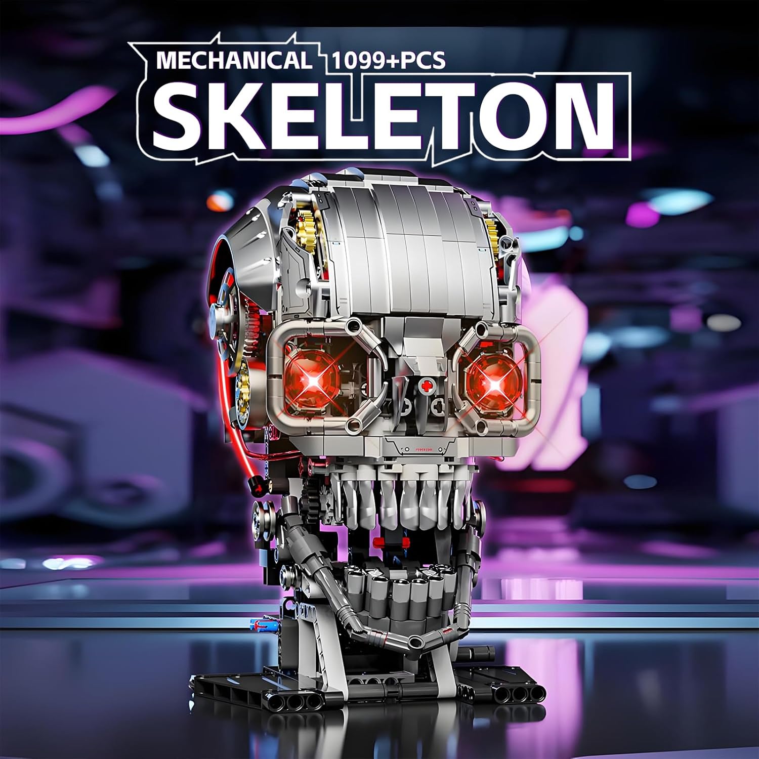 Mechanical Skull Building Block Set 1099+ Pieces 3D Poseable Model with Mandibular Teeth Bite Drive for STEM Toys for Kids & Adults Perfect for Horror Fans & Gothic Room Decor